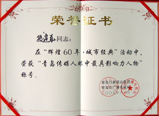 在“辉煌60年,城市经典”活动中,荣获“青岛传媒人眼中最具影响力人物”称号