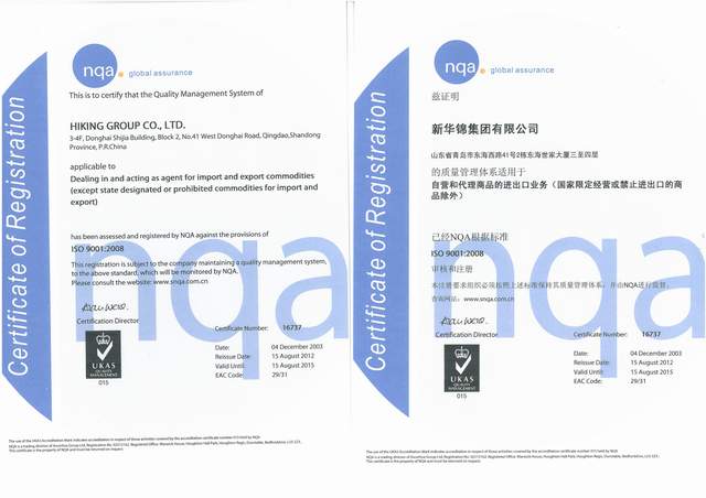 ISO9001质量管理体系认证 - 2012 - :: HIKING GROUP 新华锦首页(国际贸易)(金融投资)(老年颐养) ::
