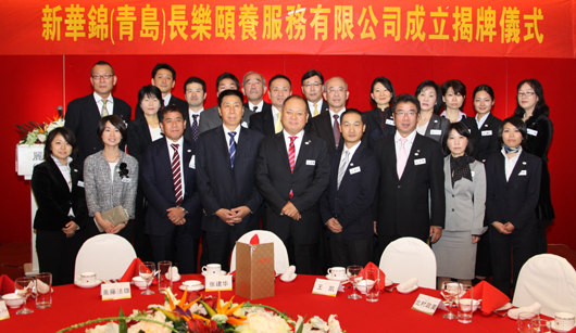 11月27日晚,新华锦(青岛)长乐颐养服务有限公司成立揭牌仪式在丽晶大酒店举行。青岛市老龄委主任李雪华女士、市民间组织管理局局长张志勤先生,日本长乐控股株式会社社长远藤正一先生、日本八木集团海外事业部中国总代表本田和洋先生、西科姆电子公司总经理北野重时先生,张董事长及集团领导、总部各部门负责人、置业集团和爱晚公司相关人员、新闻媒体记者等70余人出席了活动。仪式由世纪爱晚实业公司总经理张言松主持。