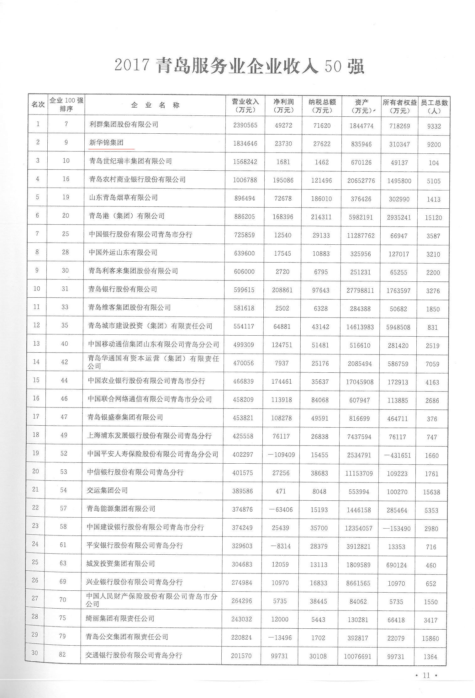 2017青岛服务业企业收入50强第2位 - 2017 - :: HIKING GROUP 新华锦首页(国际贸易)(金融投资)(老年颐养) ::