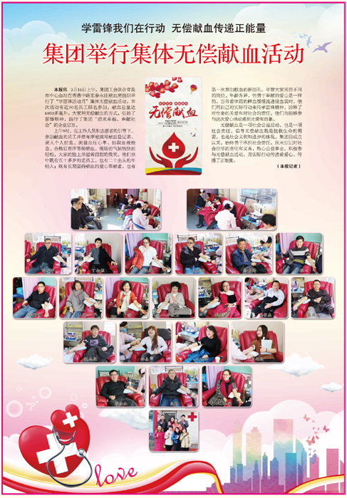 无偿献血是一项社会公益活动,也是一项社会责任,倡导无偿献血既是拯救生命的需要,也是社会文明和进步的体现。集团自成立以来,始终勇于承担社会责任,从未忘记对社会应尽的责任和义务,热心公益事业,积极参与无偿献血活动,用实际行动传递着爱心,传播了正能量。
