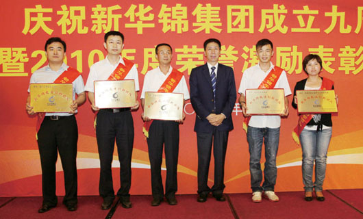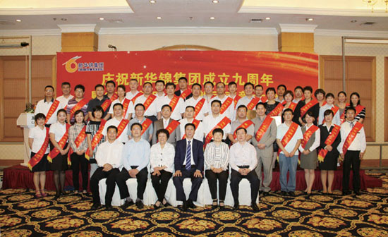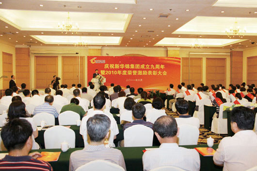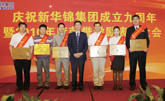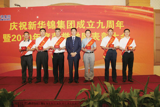 在集团成立九周年到来之际,为表彰先进团队与个人,激励干部员工干事创业的斗志,6月17日下午,集团在丽晶大酒店国际会议中心召开庆祝集团成立九周年暨2010年度荣誉激励表彰大会,隆重表彰新华锦集团山东海川工艺发制品有限公司业务三部等12个先进团队,刘曲锋等33名先进个人。集团领导班子成员、总部全体员工、各成员单位领导班子成员、获得2010年度荣誉激励团队奖项的员工代表、获得2010年度荣誉激励个人奖项的员工及家属代表近200人参加大会。