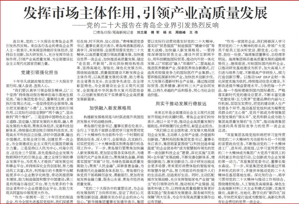 10月23日,《青岛日报》刊发报道《发挥市场主体作用 引领产业高质量发展》,报道党的二十大报告在青岛企业界引发强烈反响,张建华董事长接受采访,畅谈学习党的二十大报告体会。