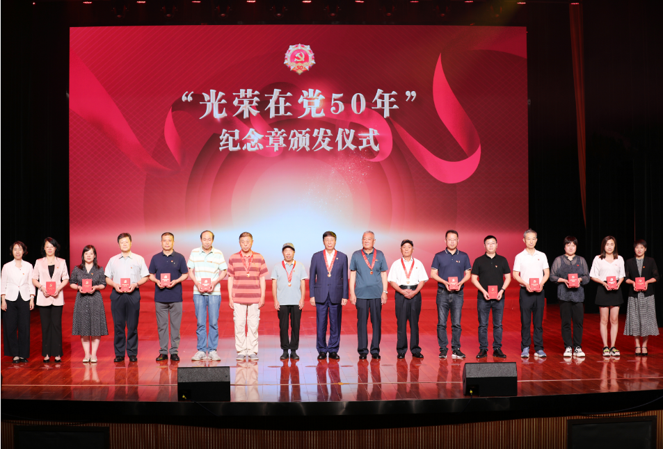 新华锦集团董事长张建华作为“光荣在党50年”的老党员,上台接受颁发“光荣在党50年”纪念章,他表示:“今年是我光荣加入中国共产党的第51年,我感到无比光荣和自豪!50年来,国家在发展,时代在巨变,感谢党给予我们安宁富足的生活,感谢党带领我们一步一步走向繁荣富强。我坚信在党的领导下,我们党的事业必将更加昌盛,我们的祖国也将越来越繁荣富强。”此次,新华锦集团党委共有9名党龄超过50年的党员获得“光荣在党50年”奖章。
