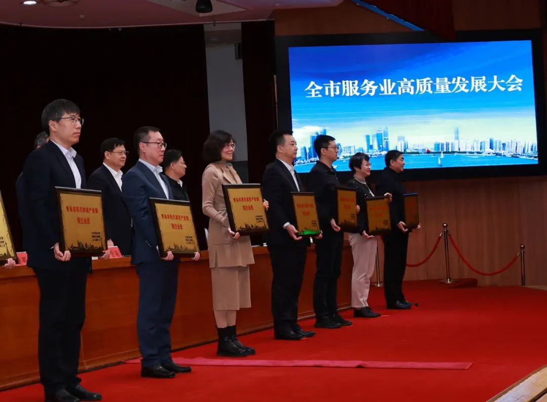 会上,发布了全市加快现代服务业高质量发展体系及《推动服务业高质量发展若干政策措施》,宣读了现代服务业41家“链主”企业名单并向企业代表颁发牌匾,新华锦集团获评“青岛市现代商贸产业链链主企业”,集团执行董事长、总裁刘笃平代表集团上台接受颁牌。