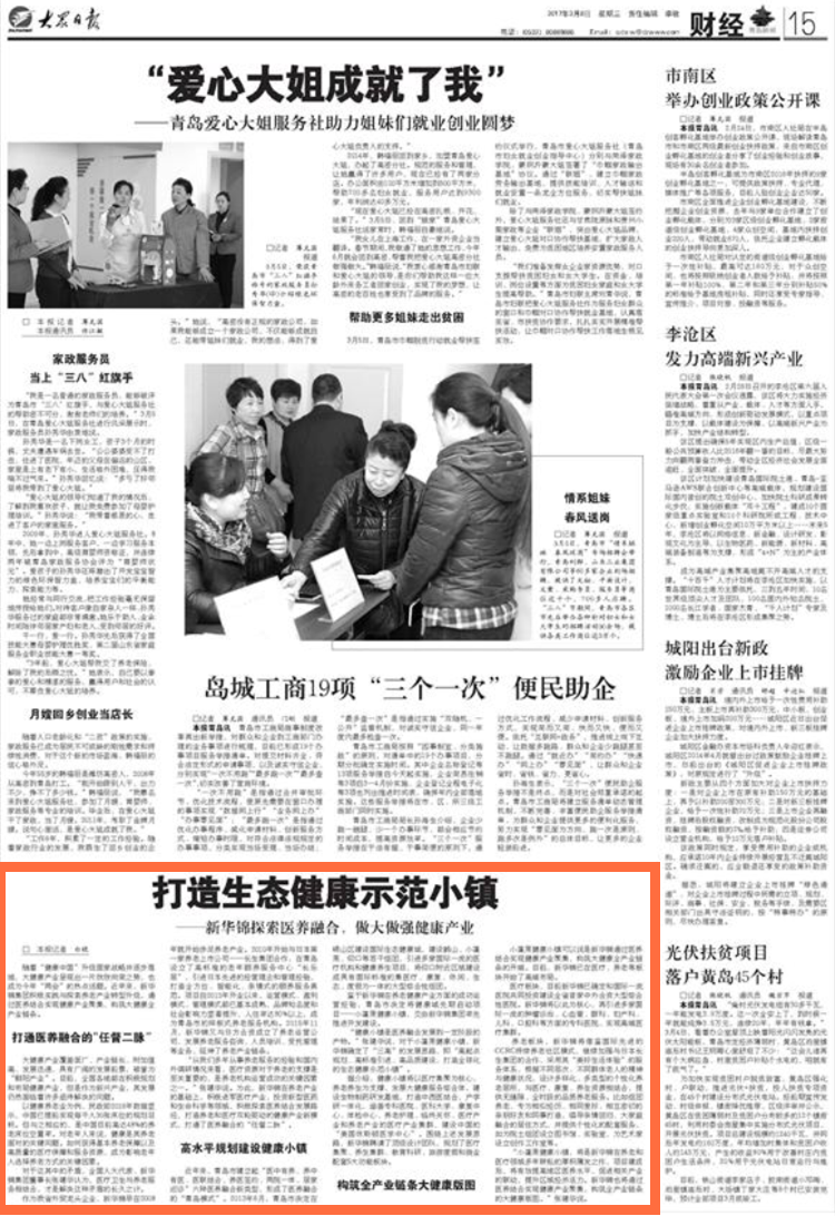 随着“健康中国”升级国家战略并逐步落地,大健康产业呈现出一片欣欣向荣之势,也成为今年“两会”的热点话题。近年来,新华锦集团积极实践与探索养老产业转型升级,通过医养结合实现健康产业聚集,构筑大健康全产业链条。