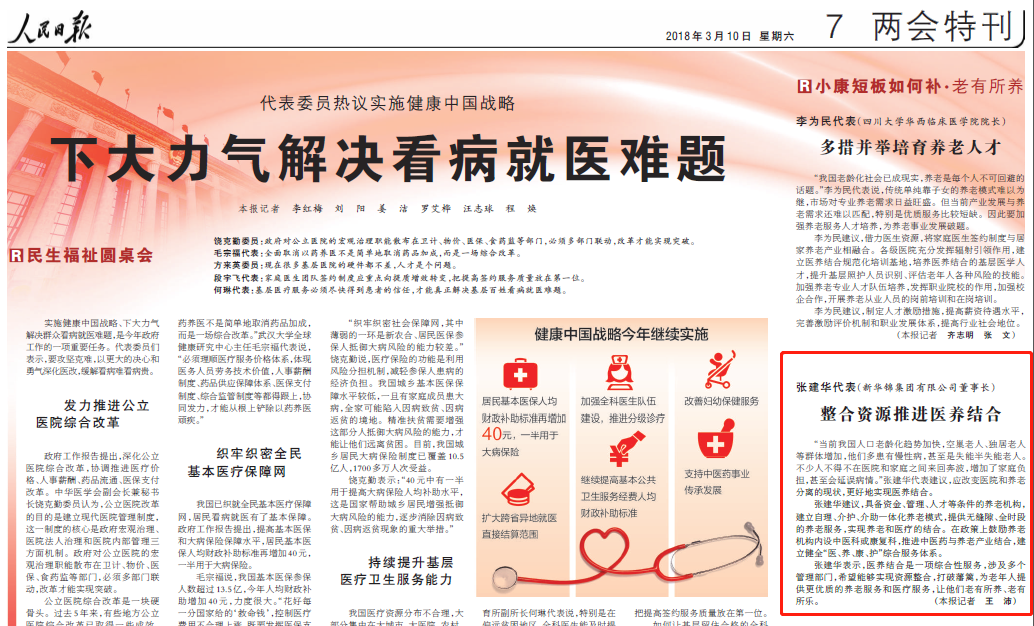 张建华表示,医养结合是一项综合性服务,涉及多个管理部门,希望能够实现资源整合,打破藩篱,为老年人提供更优质的养老服务和医疗服务,让他们老有所养、老有所乐。