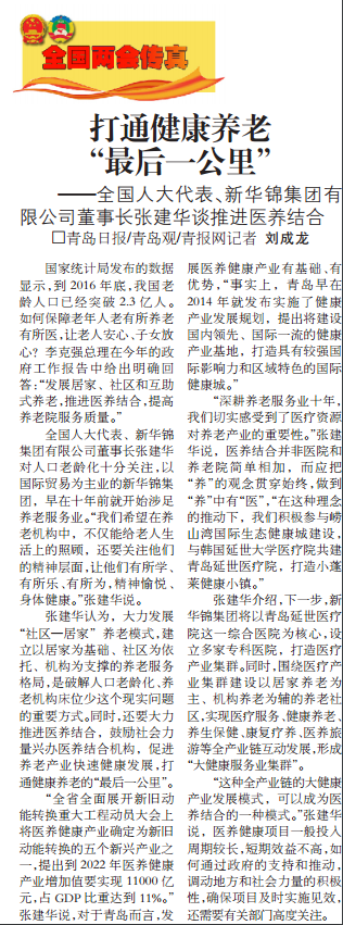 全国人大代表、新华锦集团有限公司董事长张建华对人口老龄化十分关注,以国际贸易为主业的新华锦集团,早在十年前就开始涉足养老服务业。“我们希望在养老机构中,不仅能给老人生活上的照顾,还要关注他们的精神层面,让他们有所学、有所乐、有所为,精神愉悦、身体健康。”张建华说。