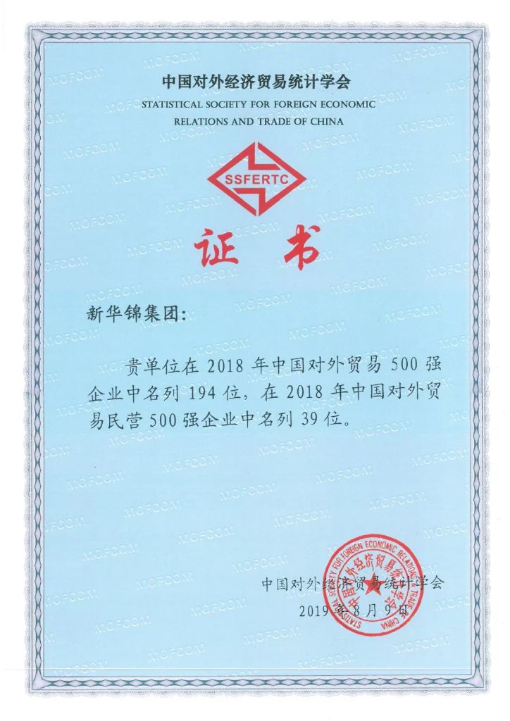 2019年中国对外贸易500强企业中名列194位,中国对外贸易民营企业500强企业中名列39位
