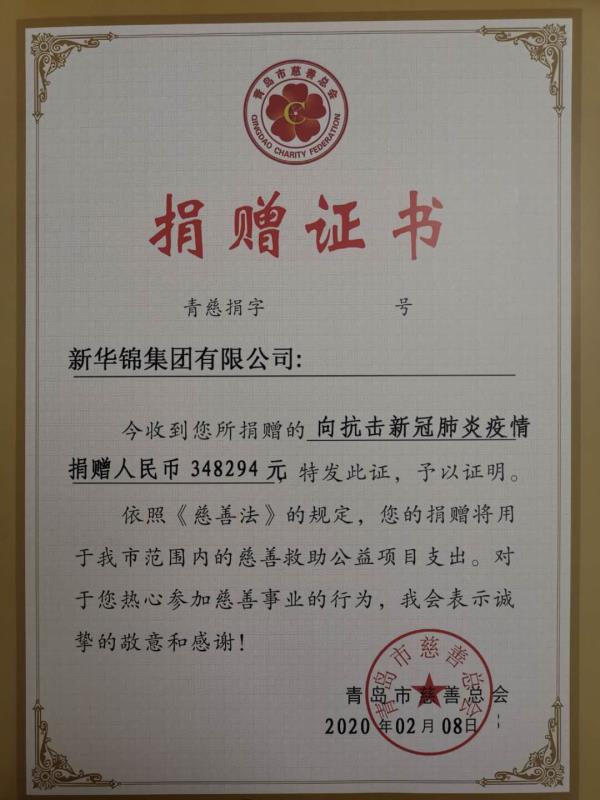 2月7日,集团员工捐助的348294元爱心善款,已通过转账的方式至青岛市慈善总会账户,由其全部捐赠给青岛的防疫一线,同时,集团还捐赠了价值100万元国内防控疫情急需的医用防护用品,助力我市抗击新型冠状病毒感染的肺炎疫情工作。