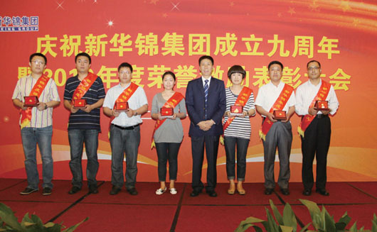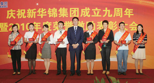 在集团成立九周年到来之际,为表彰先进团队与个人,激励干部员工干事创业的斗志,6月17日下午,集团在丽晶大酒店国际会议中心召开庆祝集团成立九周年暨2010年度荣誉激励表彰大会,隆重表彰新华锦集团山东海川工艺发制品有限公司业务三部等12个先进团队,刘曲锋等33名先进个人。集团领导班子成员、总部全体员工、各成员单位领导班子成员、获得2010年度荣誉激励团队奖项的员工代表、获得2010年度荣誉激励个人奖项的员工及家属代表近200人参加大会。