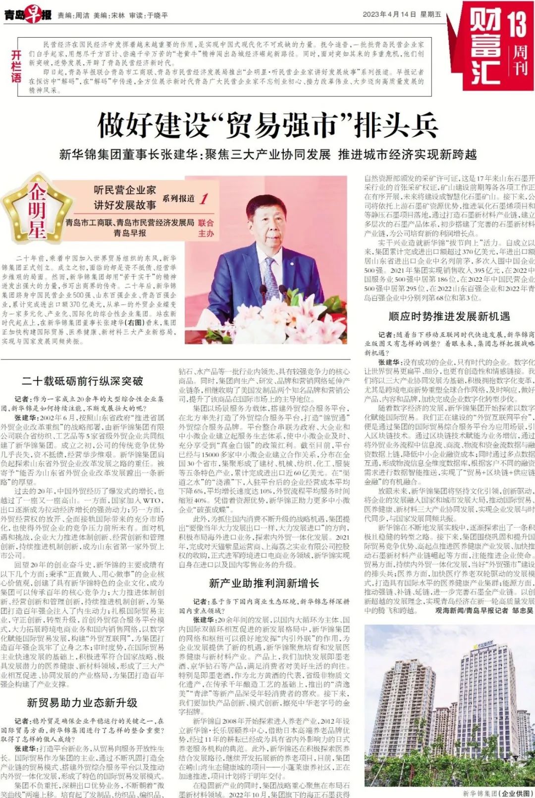 听民营企业家讲好发展故事丨《青岛早报》专访新华锦集团董事长张建华 - 媒体报道 - :: HIKING GROUP 新华锦首页(国际贸易)(金融投资)(老年颐养) ::
