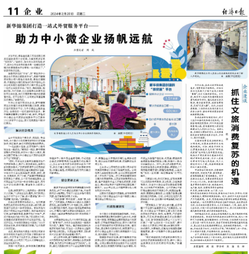 2月20日,《经济日报》刊发报道《新华锦集团打造一站式外贸服务平台 助力中小微企业扬帆远航》,对新华锦集团外贸综合服务平台解决中小微外贸企业经营痛点,整合资源要素助力外贸企业发展以及挖掘数据潜能进行数字化赋能的做法进行了关注报道。
