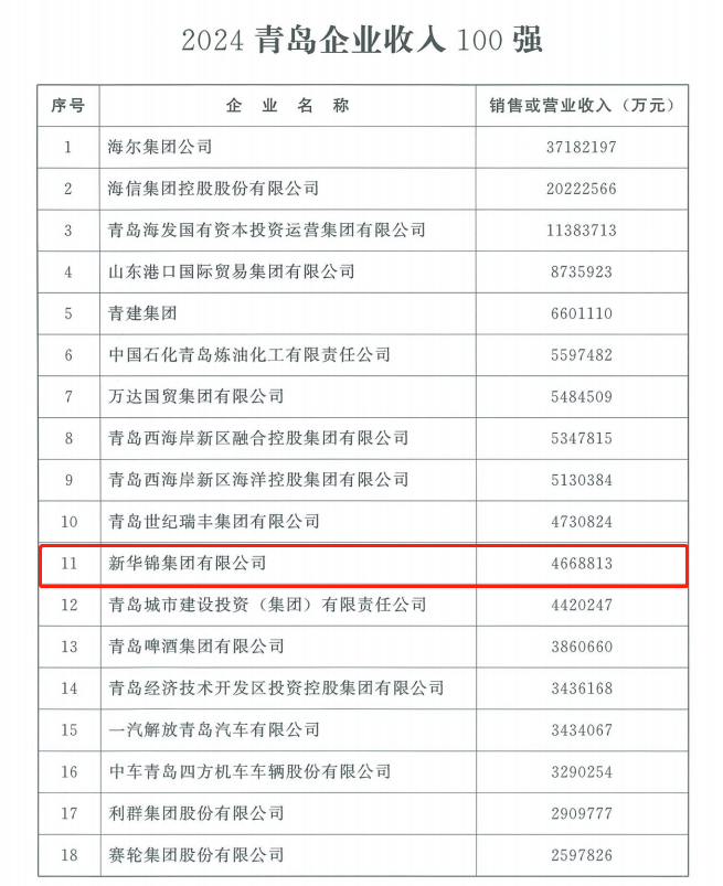 新华锦集团位列2024青岛企业百强第11位
