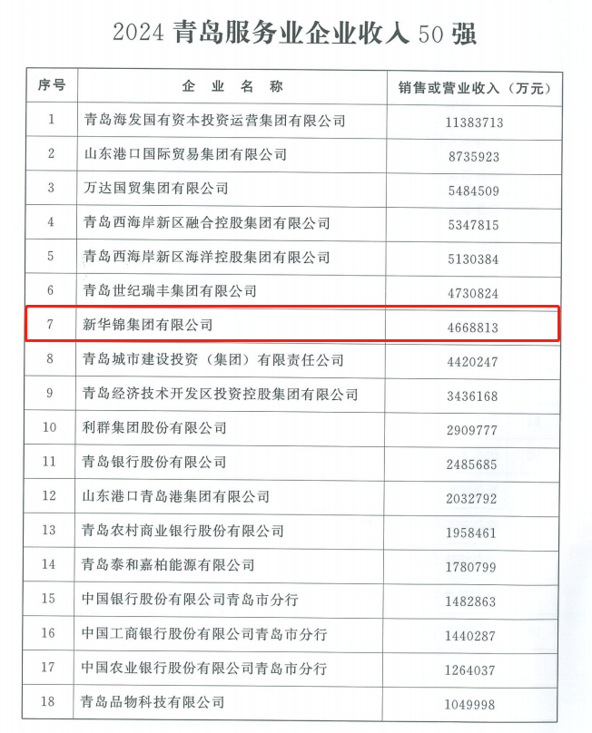 活动中,青岛市企业联合会、青岛市企业家协会联合发布了2024青岛企业100强、青岛制造业企业100强和青岛服务业企业50强名单。新华锦集团以2023年466.88亿元的营业收入,位列2024青岛企业百强第11位、服务业50强第7位。