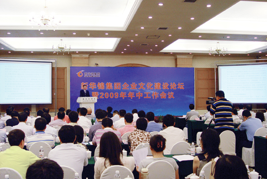 在19日上午的大会上,张董事长代表集团领导集体作了题为《危机下的责任和行动》的主题发言。主题发言分为企业文化的战略意义、责任和行动、坚定不移地推行以“十二条体会”为核心的新华锦文化三个部分。关于企业文化的战略意义,张董事长指出,企业文化所构建的是企业的价值体系,是全体员工一致认同的价值观和核心理念,是融合于社会主流价值的载体,是展示给合作者、竞争者的精神风貌。文化战略作为企业整体战略的重要组成部分,在实践过程中具有整合、统合、竞合三个方面的功能。七年来,集团在企业文化建设方面的初步实践表明,文化战略应全面融入到日常管理和经营中,对强化集团管控能力、促进资源配置效率、提高企业管理水平、提升企业经营效益将起到积极作用。
