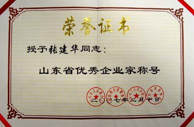 2007年2月授予张建华同志“山东省优秀企业家称号”