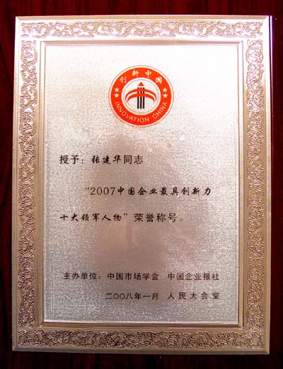 2008年1月中国市场学会、中国企业报社授予张建华同志“2007中国企业最具创新力十大领军人 - 领导风采 - :: HIKING GROUP 新华锦首页(国际贸易)(金融投资)(老年颐养) ::