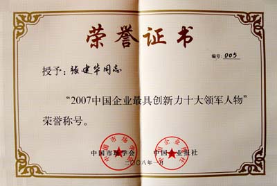 2008年1月中国市场学会、中国企业报社授予张建华同志“2007中国企业最具创新力十大领军人