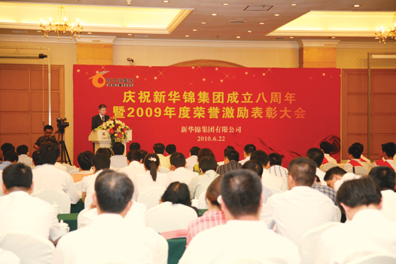 表彰会上,徐东波副总裁宣读了《关于表彰2009年度荣誉激励获奖团队与个人的决定》。在欢快的乐曲声中,集团领导分别向获得“新华锦最佳创新团队”、“新华锦最佳和谐团队”、“新华锦最佳管理团队”的员工代表,获得“新华锦年度模范员工”、“新华锦年度最佳责任员工”、“新华锦年度突出贡献员工”的个人颁发了奖牌和金质奖章。获奖的先进团队和个人代表、家属代表先后发言。最后,张董事长作了重要讲话。