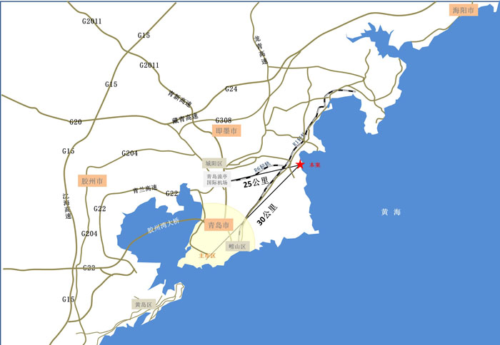 项目距离青岛市中心城区约30公里, 距离流亭国际机场25公里。滨海大道和王沙路两条主干道在项目内交汇,正在建设中的两条轻轨线路,即连接市区的R1线和连接机场的R6线路亦在项目交汇。通过城际铁路串联,成为烟台、威海、青岛、潍坊等地区“一小时经济圈”的中心枢纽。
