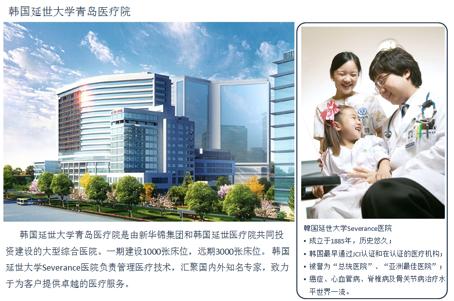集团积极进军医疗医药和生命科学领域,与韩国医疗水平领先的延世大学医疗院合作,在青岛打造高标准合资医院,并以延世青岛医院为核心,配套康复中心、慈善医院等医疗机构,打造以医疗为主题,以养老、养生、教育、度假为支撑,以生态环境、无缝服务为保障,生态化、国际化的医疗健康养生组团。通过医养结合实现健康产业聚集,构筑全产业链条的大健康版图,继续履行服务民众、造福社会的企业责任。